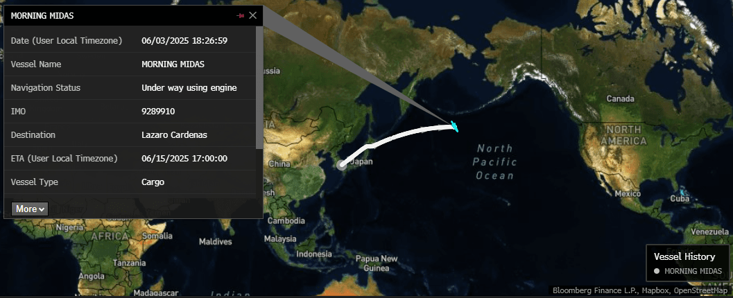 Morning Midas had departed China in late May with a scheduled port call in Mexico, according to Bloomberg data.