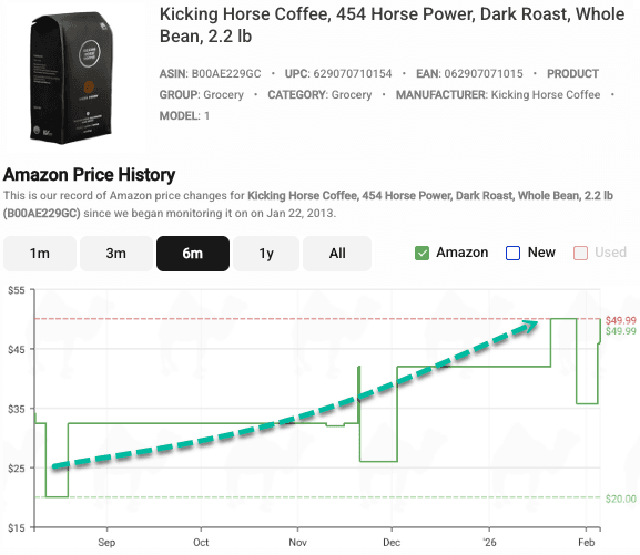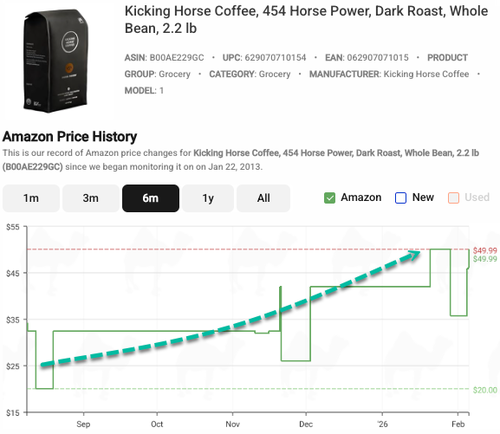 Tracking a single brand of dark-roast arabica beans on Amazon via the price-tracking website CamelCamelCamel shows that a 2.2-pound bag has nearly doubled in price since August.