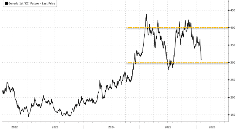 Bloomberg reports this decline was driven by a sharp rebound in exchange inventories, with coffee deliveries doubling over the past two weeks. That restocking has eased fears over near-term supply tightness that previously sent prices surging to nearly $4.5 a pound in 2025.