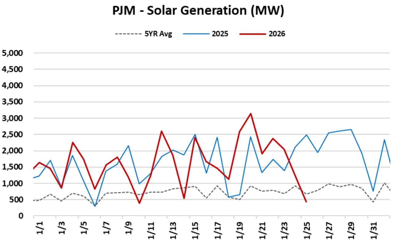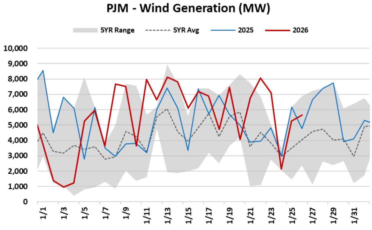 During peak demand periods in PJM - the nation's largest grid operator - thermal and nuclear generation dominated the dispatch stack. As the cold conditions arrived, natural gas provided 43% of generation and coal contributed 23%, while wind and solar fell to a combined 3-4% of the total fuel mix.