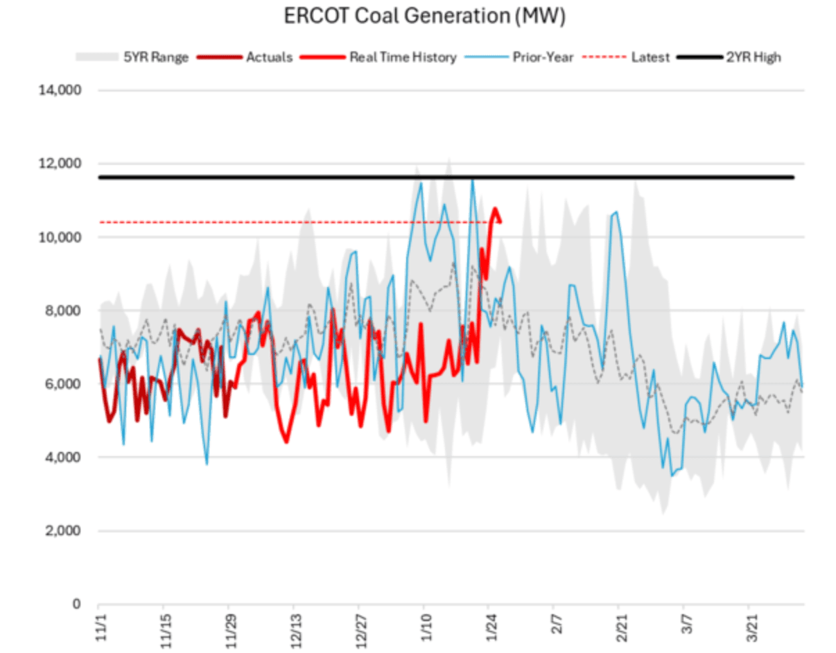 ERCOT coal burns lifted as well, nearing 10,400 MW early in the morning as peak load levels hit.