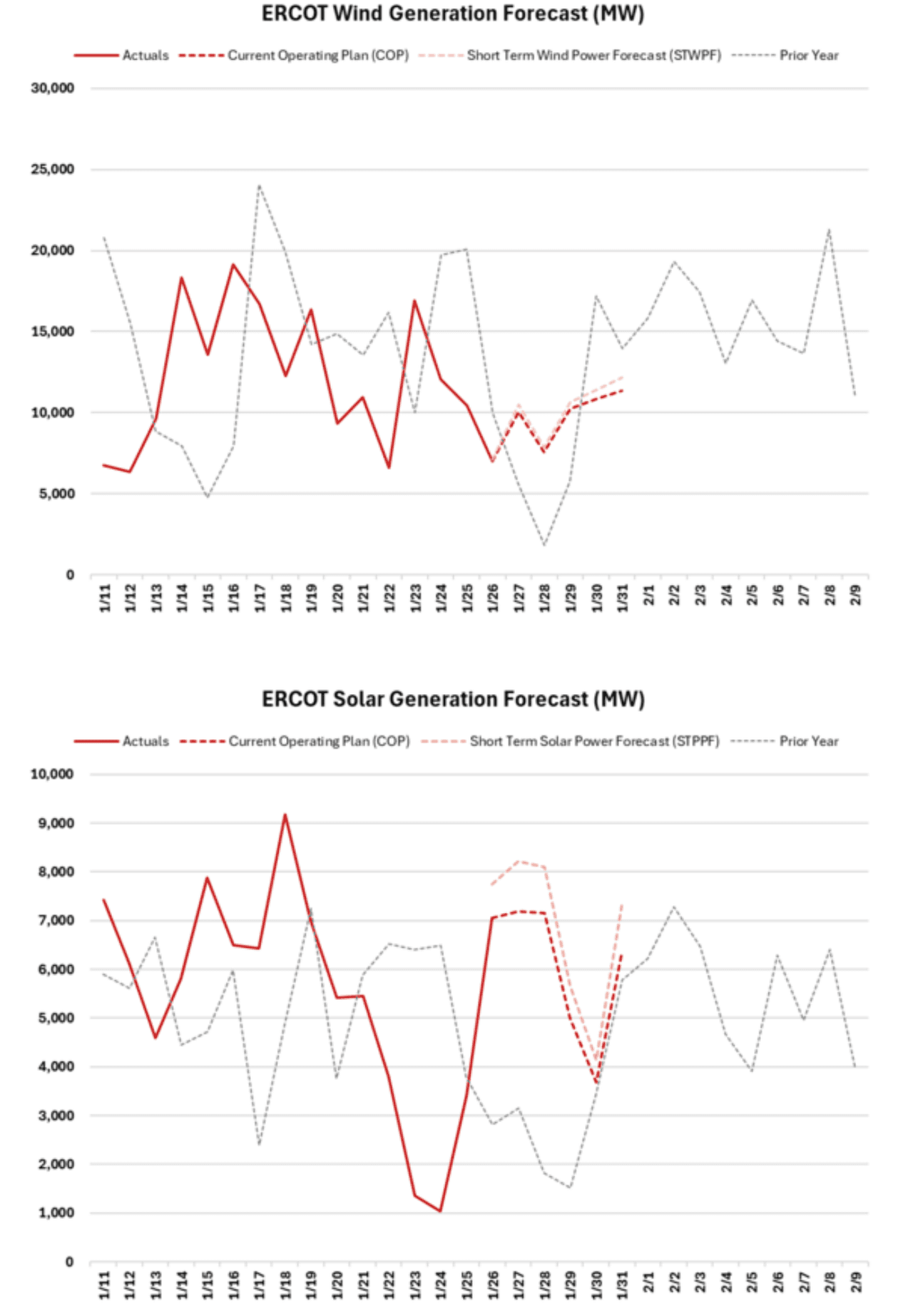 ERCOT wind and solar underperformed, falling well below the levels seen earlier this month.