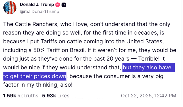 The president concluded his Truth Social post by saying that ranchers need "to get their prices down," noting that "the consumer is a very big factor in my thinking as well."
