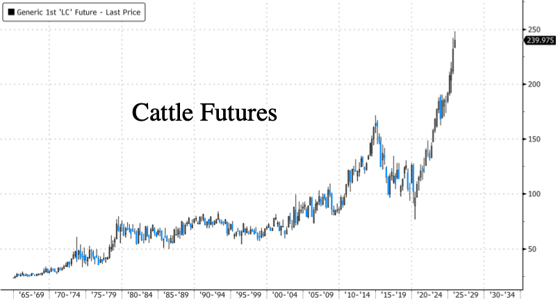 U.S. cattle futures are no longer on track for their largest year-to-date gain since 1978. Instead, selling pressure has eroded gains to about 25%, yet it still marks the strongest annual increase since 2010. The pullback comes as President Trump and White House officials confront yet another challenge in the fight against sticky food inflation: a nationwide cattle shortage (years in the making) that has pushed cattle futures to record highs and sent supermarket beef prices to unaffordable levels for working-poor households.