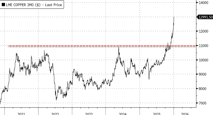 Goldman's "circular melt-up" call and its recent upgrade to the 2026 London Metal Exchange (LME) copper price forecast have so far proven correct, as the industrial metal surged above $13,000 a ton with traders continuing to price in tighter global supply and a broader risk-on mood across metals.