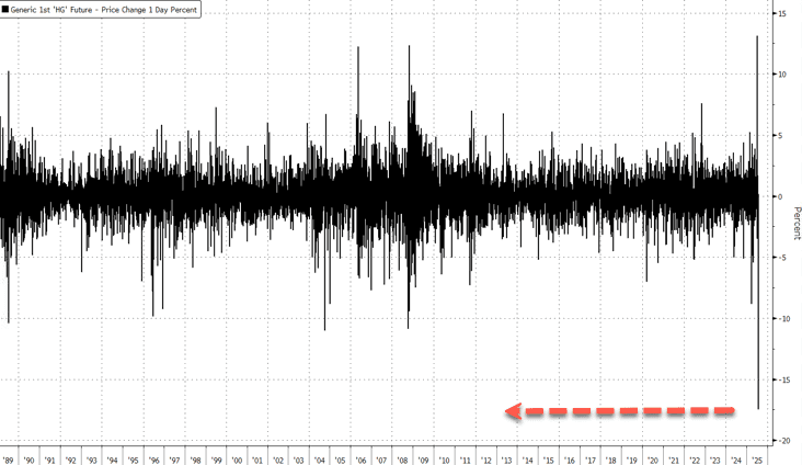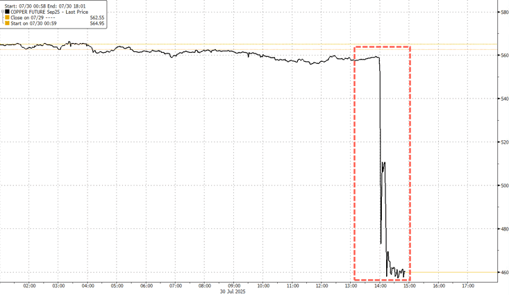 U.S. copper futures crashed over 19% within minutes around 2:00 p.m. ET, marking the largest intraday drop on record, after the White House announced a 50% tariff on all semi-finished copper imports starting August 1.