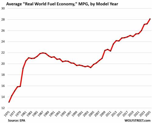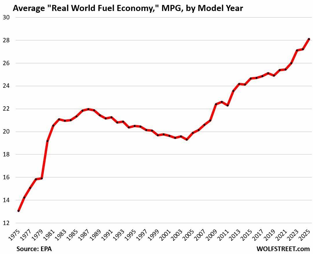 Over the past 25 years, the average fuel economy of all passenger vehicles sold in the US rose by 43%, to a record of 28.1 “real world” MPG for the 2025 model year, according to preliminary data from the EPA last month.