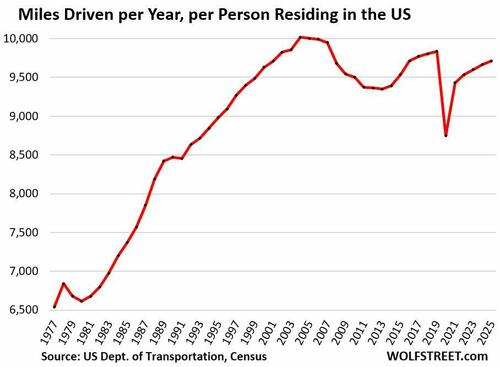 But people drive a little less: Miles driven per person residing in the US, at 9,710 miles in 2025, was 3.1% below the peak in 2004.