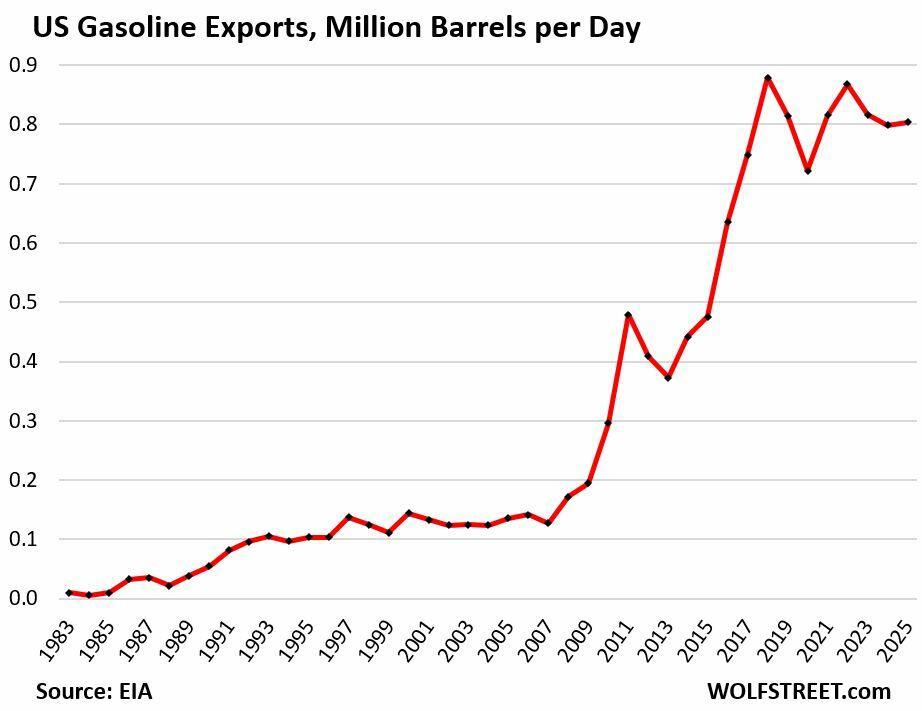 Gasoline exports started soaring in 2008, surpassed 700,000 barrels per day for the first time in 2017, hit 879,000 barrels per day in 2018, and have stayed in that range since then. In 2025, gasoline exports edged up to 804,000 barrels per day.