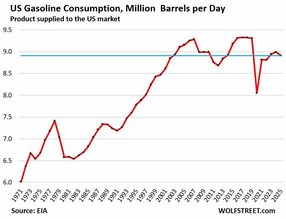 Gasoline consumption in the US, in terms of product supplied to gas stations, declined by about 1% in 2025, to 8.91 million barrels per day, according to EIA data, below where consumption had first been in 2003, even though the US population increased by 52 million people, or by 18%, over the same period.