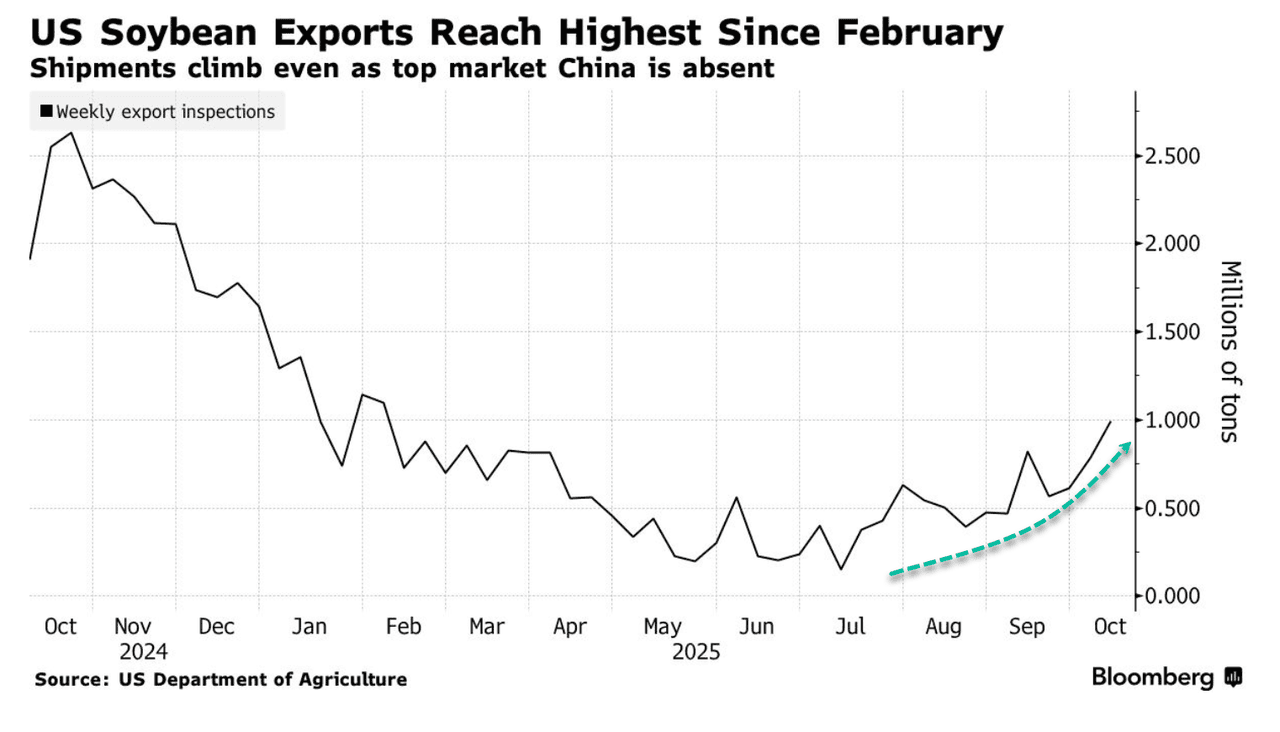 U.S. exports shipped 994,000 tons of soybeans last week, with major destinations including Bangladesh, Italy, Spain, and South Korea. This comes as the top buyer, China, remained absent from the market.