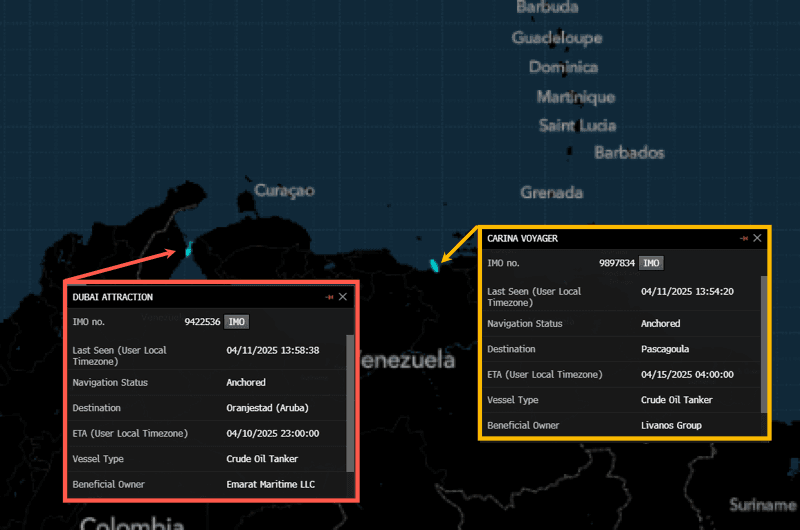 As of Friday, the Chevron-chartered vessels Dubai Attraction and Carina Voyager remained loaded in Venezuelan waters waiting for paperwork for the cargoes' return, according to the sources and LSEG shipping data.