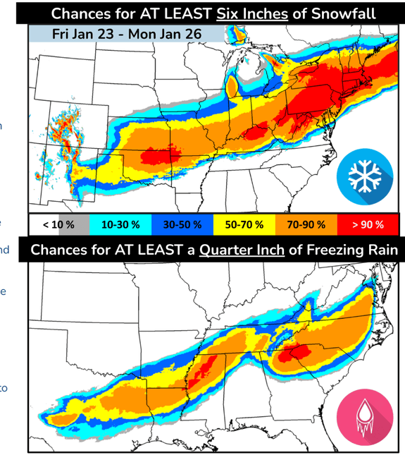 NOAA's latest forecast shows freezing rain concentrations from Texas to the Carolinas, with six-inch snowfall probabilities concentrated in Appalachia. Ice accumulation is expected across the region through January 26.