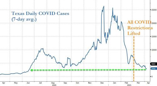 More than a month has passed since Texas Gov. Greg Abbott shocked the Faucis of the world by scrapping COVID-inspired restrictions on businesses and individuals, including removing the mask mandate. The decisions prompted Dr. Anthony Fauci and legions of public health "experts" to warn about the devastating consequences - thousands of unnecessary deaths would result, they said - however, as the data show, practically every metric has shown that the Lone Star State's outbreak has continued to recede, even as blue states like Michigan are seeing a new surge in infections (believed to be driven by "mutant" strains).