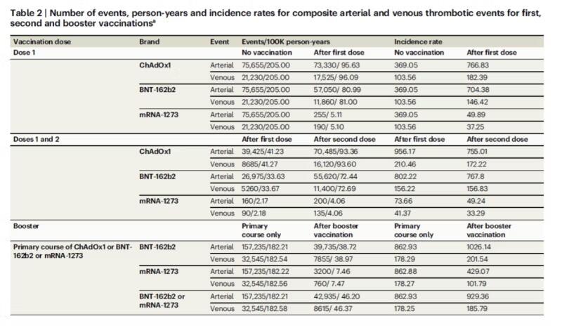This seems to be a straightforward outcome, based on a most inclusive sample – the whole population of England. However, Table 2 shows incidence rates of cardiovascular events were substantially higher (nearly double for arterial events) after the first dose of the Pfizer and AstraZeneca vaccines, compared to no vaccination: