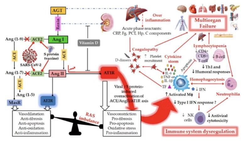 In fact, the viral entrance promotes a downregulation of ACE2 followed by RAS balance dysregulation and an overactivation of the angiotensin II (Ang II)–angiotensin II type I receptor (AT1R) axis, which is characterized by a strong vasoconstriction and the induction of the profibrotic, proapoptotic and proinflammatory signalizations in the lungs and other organs. This mechanism features a massive cytokine storm, hypercoagulation, an acute respiratory distress syndrome (ARDS) and subsequent multiple organ damage.