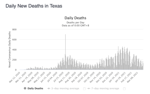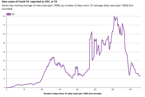 I'm sitting at a bar in Texas, surrounded by maskless people, looking at folks on the streets walking around like life is normal, talking with nice and friendly faces, feeling like things in the world are more-or-less normal. Cases and deaths attributed to Covid are, like everywhere else, falling dramatically.