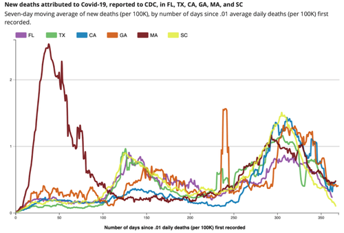 The CDC has a very helpful tool that allows anyone to compare open vs closed states. The results are devastating for those who believe that lockdowns are the way to control a virus. In this chart we compare closed states Massachusetts and California with open states Georgia, Florida, Texas, and South Carolina.
