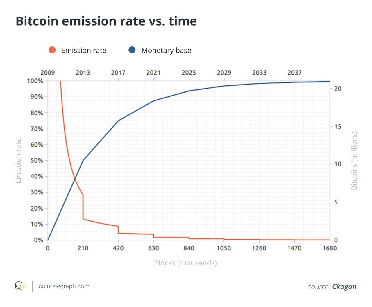 The reason for this uneven distribution is Bitcoin’s exponential issuance schedule, governed by an event called the halving. When Bitcoin launched in 2009, the block reward was 50 BTC. Every 210,000 blocks — or approximately every four years — that reward is cut in half.