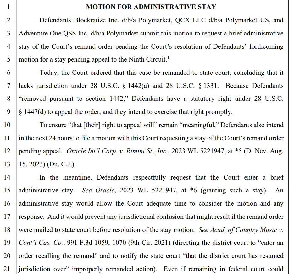 In response to the ruling, Polymarket’s parent company submitted a motion to request a brief administrative stay of the court’s remand order, the filing shows.