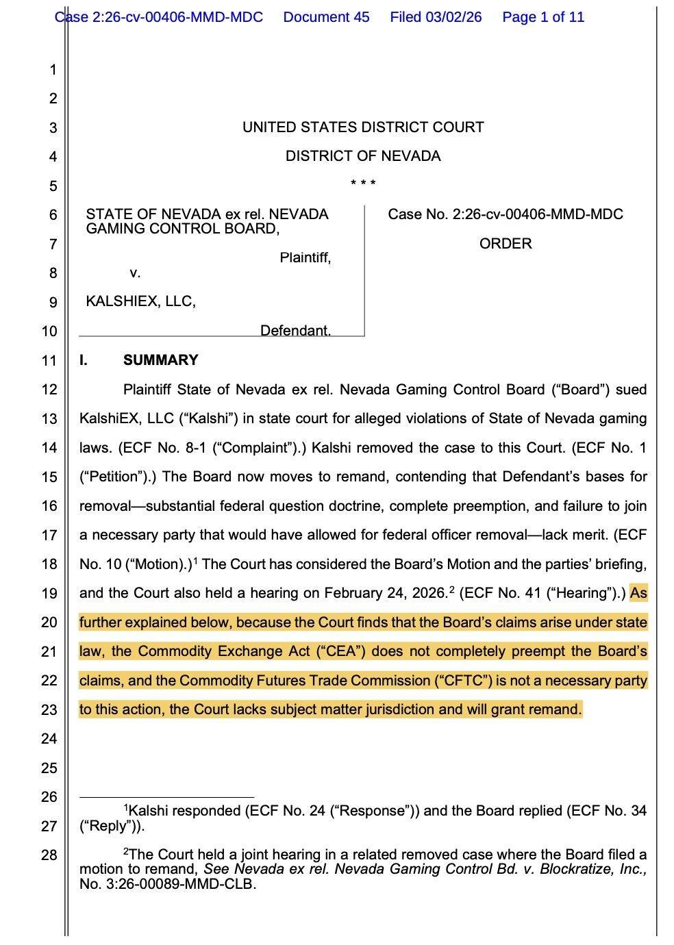 On Tuesday, a federal judge also remanded Nevada’s civil enforcement action against Kalshi back to state court, exposing Kalshi to an “imminent temporary restraining order” barring it from offering event contracts in the state, according to a court filing seen by sports betting and gaming-focused lawyer Daniel Wallach.