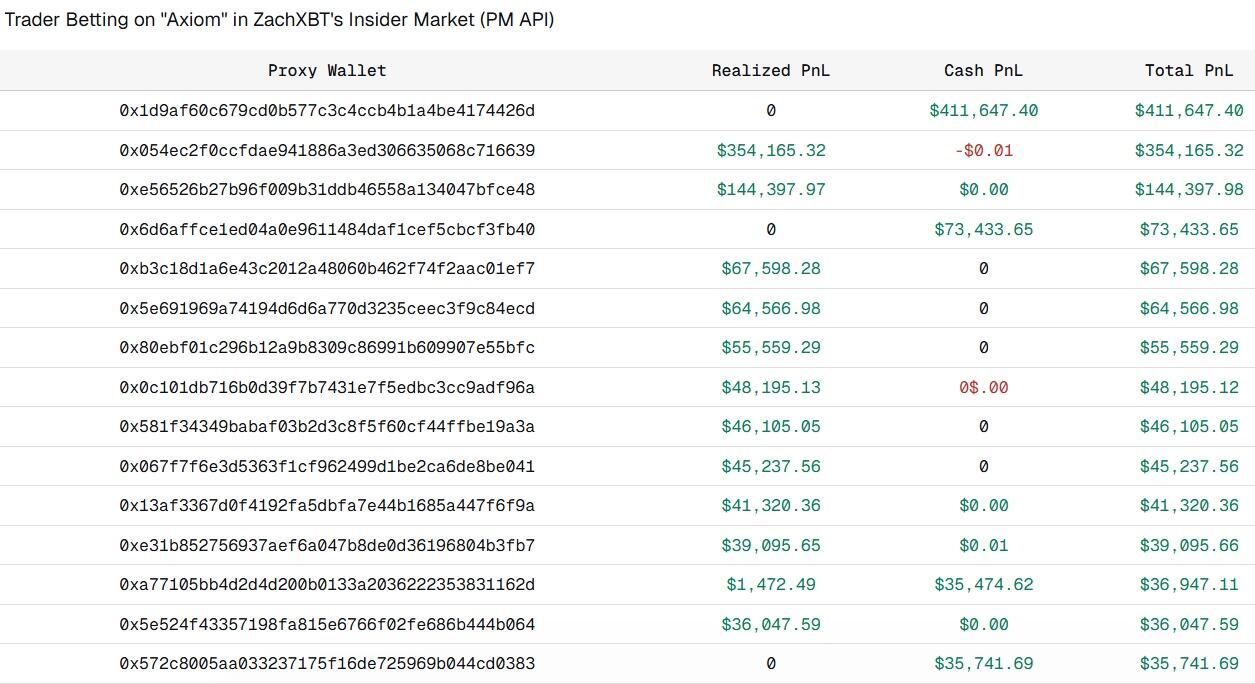Top wallets betting on Axiom in ZachXBT’s insider exposé. Source: Dune