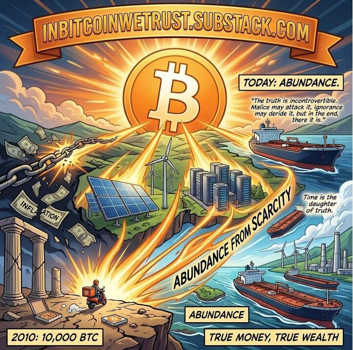 As Bitcoin holders, we cease to be the victims of hidden inflation taxes. Instead, we become the direct beneficiaries of technological abundance. We capture that abundance in the form of exponentially greater purchasing power. The transformation of a 10,000 BTC stack from two pizzas to a fleet of supertankers is not a glitch; it is the correct mathematical repricing of the world against a true, unmanipulated denominator.