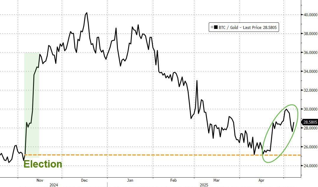 The relationship has been very cyclical since the election when 'digital gold' dramatically outperformance the barbarous relic. But from the start of February, gold has outperformed bitcoin.. until erasing all of the outperformance and prompting a relative recovery for crypto...