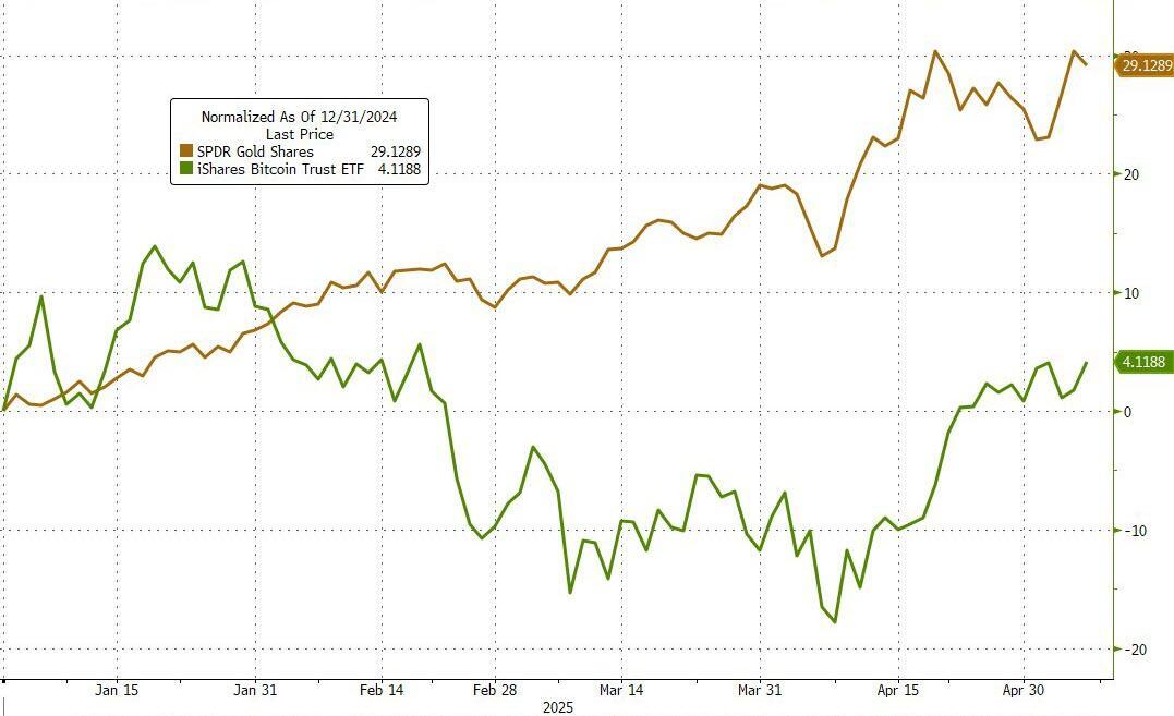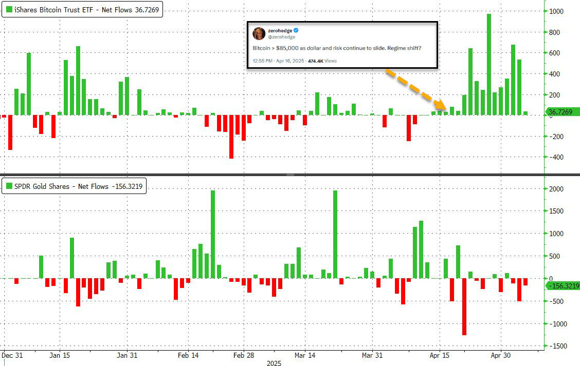 However, despite this dramatic divergence, the performance chasm has failed to deter investors putting new money to work as inflows into IBIT (BlackRock's spot bitcoin ETF) have surpassed inflows into GLD (SPDR Gold Trust ETF).