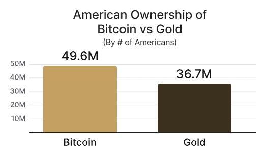 Bitcoin is also emerging as America’s preferred reserve asset, overtaking gold. Over 49.6 million Americans are in favor of holding Bitcoin, compared to 36.7 million who still prefer gold.