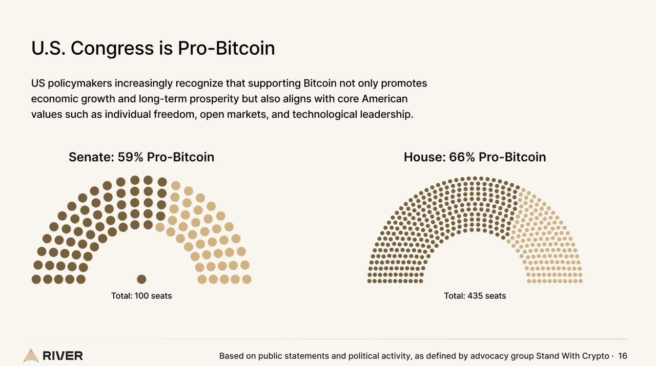 Politically, support for Bitcoin is gaining significant momentum across the U.S. government. As of now, 59% of U.S. Senators and 66% of House Representatives openly support pro-Bitcoin policies, signaling a notable shift in political attitudes and greater acceptance of digital assets as key components of America’s economic future.