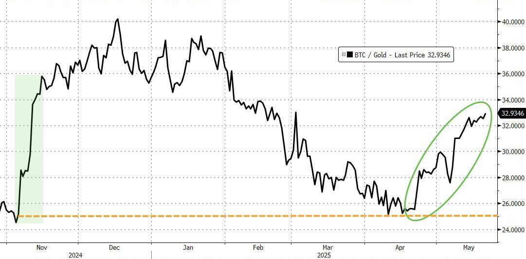 Since Trump's Liberation Day (and now amid the 'One Big Beautiful Bill'), while gold has rallied solidly, Bitcoin appears to have been the preferred position for global uncertainty (after testing down to pre-election levels)...