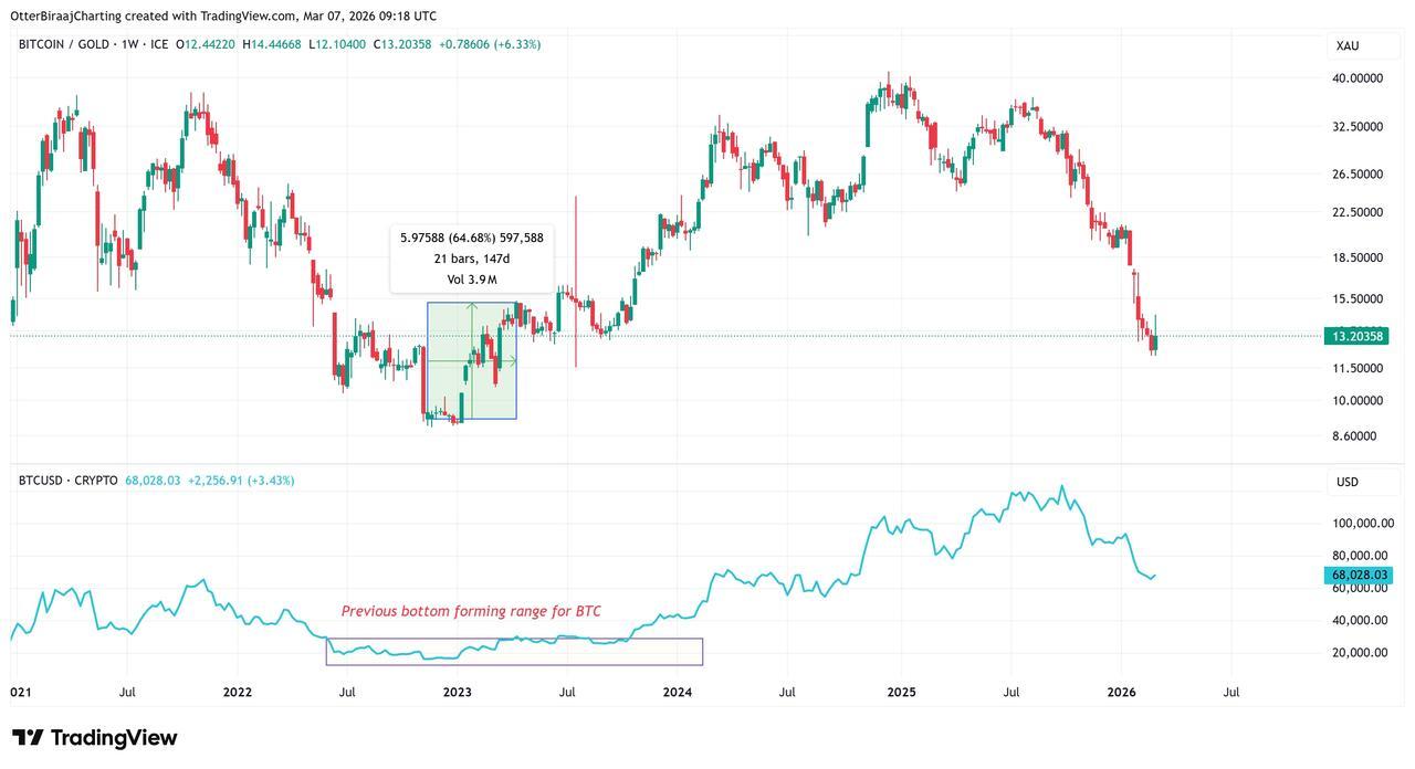 The BTC-to-gold ratio currently trades near the same consolidation zone seen during the earlier rotation phases in 2022-2023.
