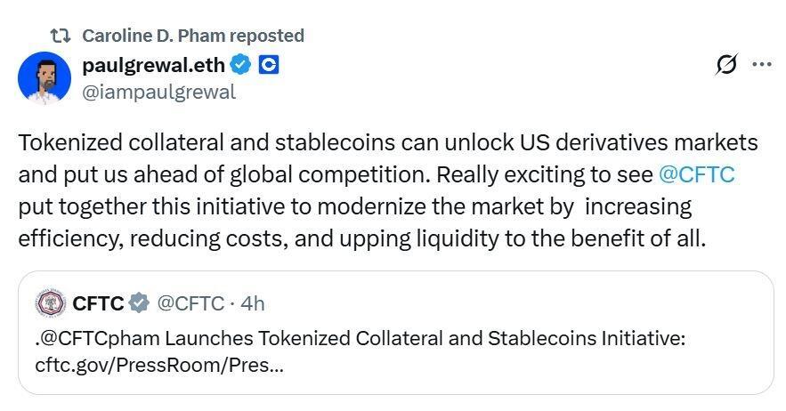 Coinbase chief legal officer Paul Grewal also backed the initiative, and said in a X post on Tuesday that “tokenized collateral and stablecoins can unlock US derivatives markets and put us ahead of global competition.”