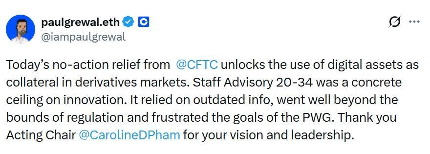 Pham said in an X post on Monday that the “guidance provides regulatory clarity and opens the door for more digital assets to be added as collateral by exchanges and brokers, in addition to US Treasurys and money market funds.”