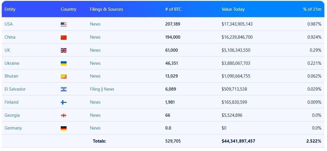 Countries and governments that hold BTC. Source: Bitbo