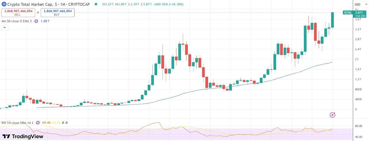 The rise in prices across the crypto ecosystem has lifted the total market capitalization to $4 trillion...