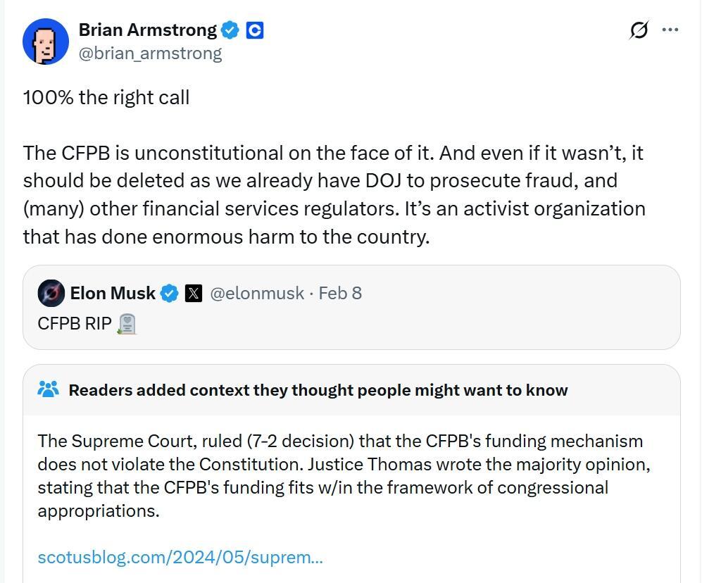 Further of note is the fact that Coinbase CEO Brian Armstrong has applauded the efforts of the Department of Government Efficiency (DOGE), with Elon Musk at the helm, to dismantle the Consumer Financial Protection Bureau (CFPB).