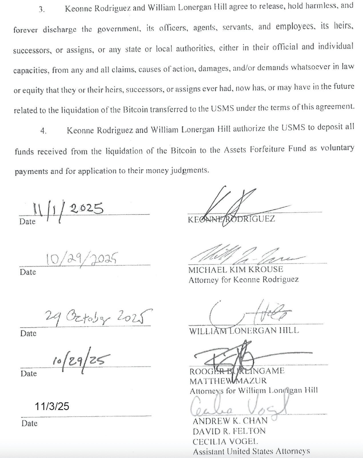 As per the document, the defendants agreed to transfer $6,367,139.69 worth of bitcoin — 57.55353033 bitcoin at the time the final party signed the agreement, which was Assistant United States Attorney Cecilia Vogelon November 3, 2025 — to the USMS.