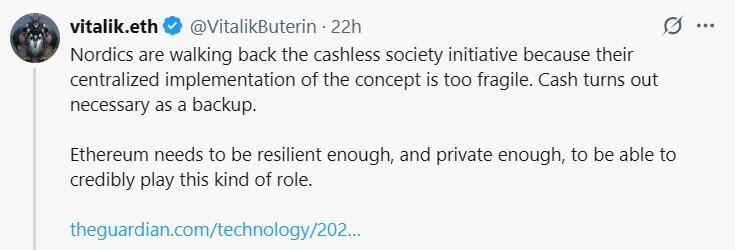 “Nordics are walking back the cashless society initiative because their centralized implementation of the concept is too fragile,” Buterin wrote, citing a March 16 article by The Guardian. “Cash turns out necessary as a backup.”