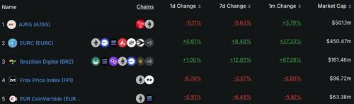 Top five largest non-USD stablecoins by market capitalization. Source: DefiLlama