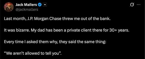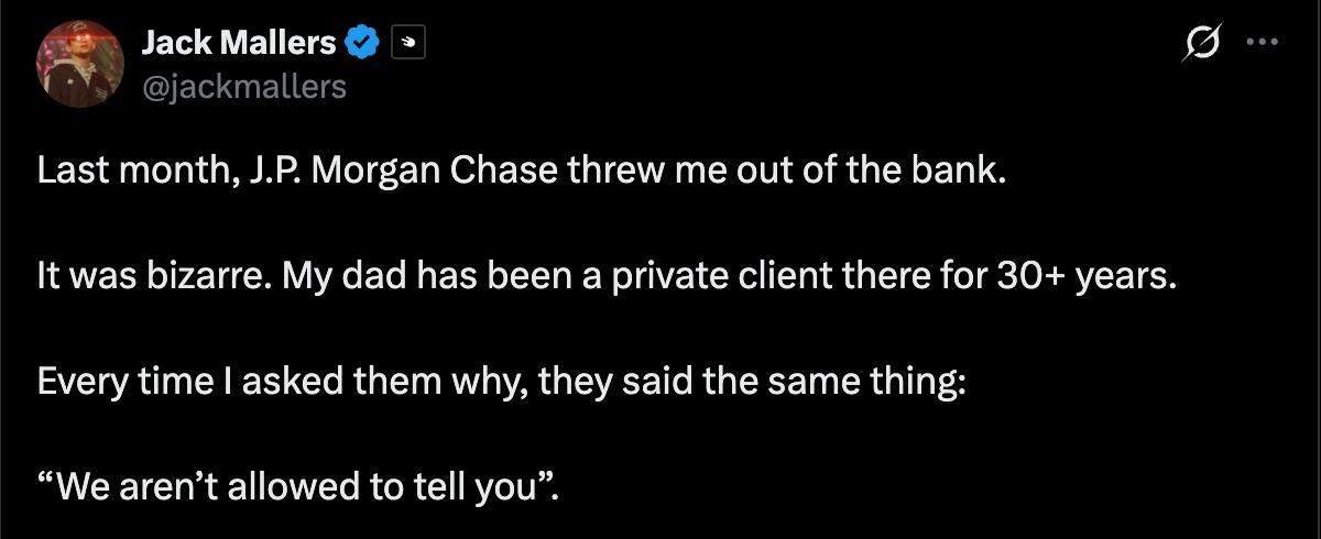 In November, Jack Mallers, the CEO of Bitcoin payments company Strike, said he was debanked by financial services company JPMorgan without explanation.