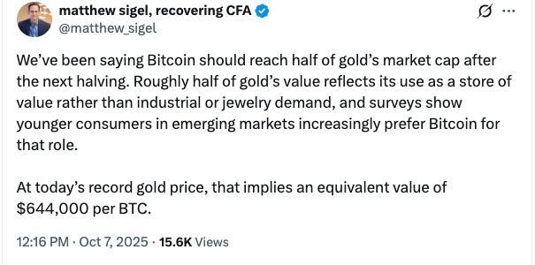 Gold futures hit a record high of above $4,000 per ounce as traders rushed to the asset, which has long been seen as a safe haven. Sigel said that its record price “implies an equivalent value of $644,000 per [Bitcoin].”