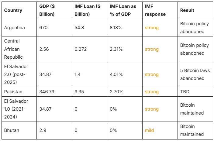 Each country with an IMF loan who has adopted, or attempted to adopt Bitcoin at a nation-state level has been successfully thwarted, or largely thwarted by the IMF.