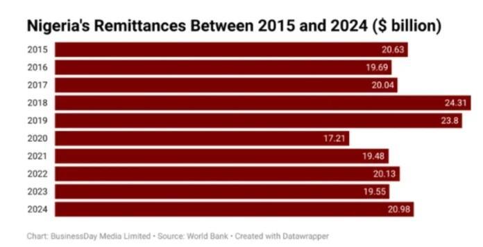 Remittances totaled almost $21 billion in 2024, representing over 4% of Nigeria’s GDP