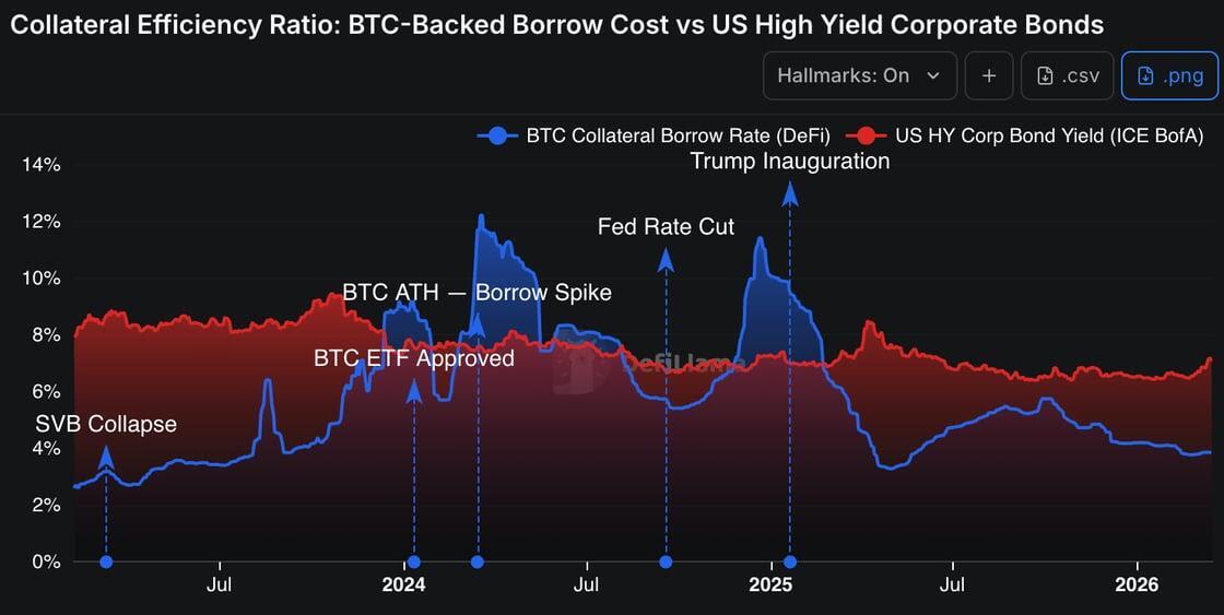 The chart clearly shows that BTC collateralized borrowing rates are consistently trending below US high-yield corporate bond yields, even though BTC remains a more volatile asset.