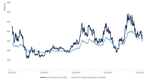 Separately for Ethereum, Goldman notes that the market cap is now below its realized market cap (which values each coin at the last time they moved on the network - representing the aggregate cost basis), signifying that most ETH holders are now sitting on a loss...