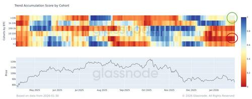 According to Glassnode data, the largest whales are in a "light accumulation" phase and have maintained a neutral-to-slightly-positive balance trend since bitcoin fell to $80,000 in late November. During this period, price has largely consolidated, trading within a $80,000 to $97,000 range through the end of January.