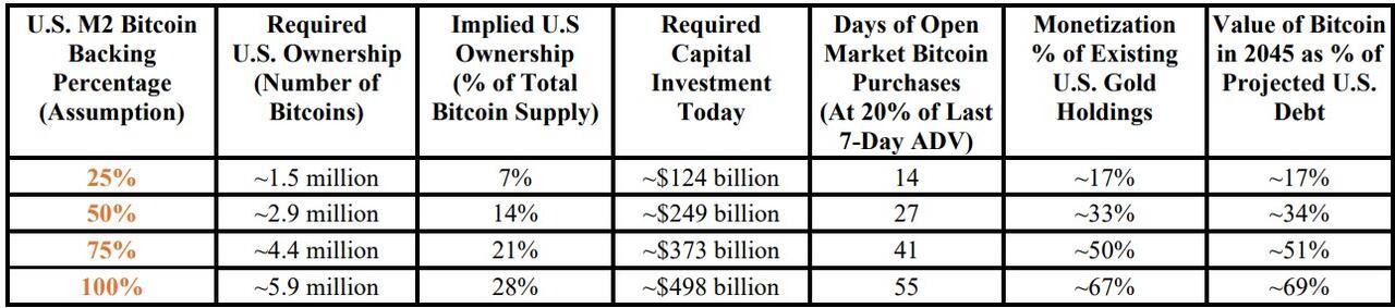 Below is a table showing the required U.S. ownership of Bitcoin for different levels of backing by 2045: