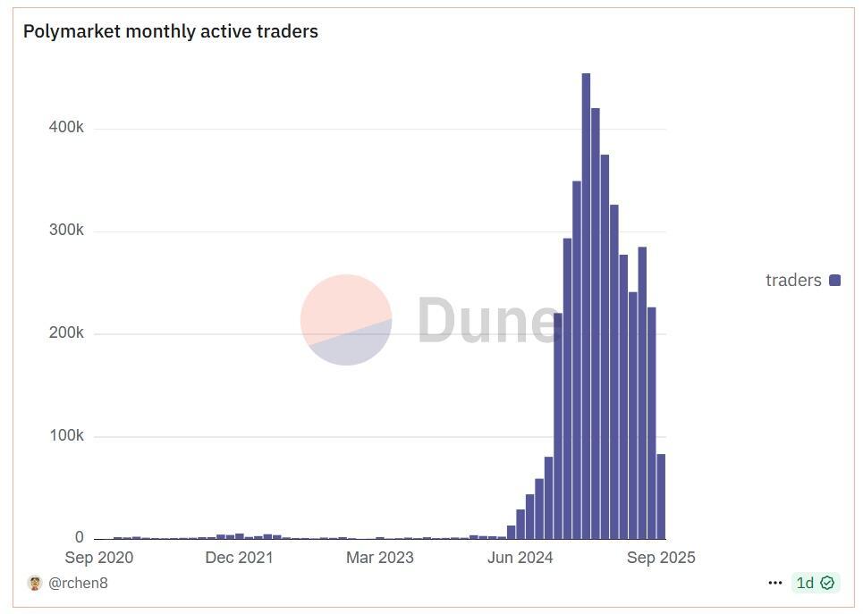 Polymarket activity skyrocketed during the US presidential election, based on monthly active traders. Source: Dune